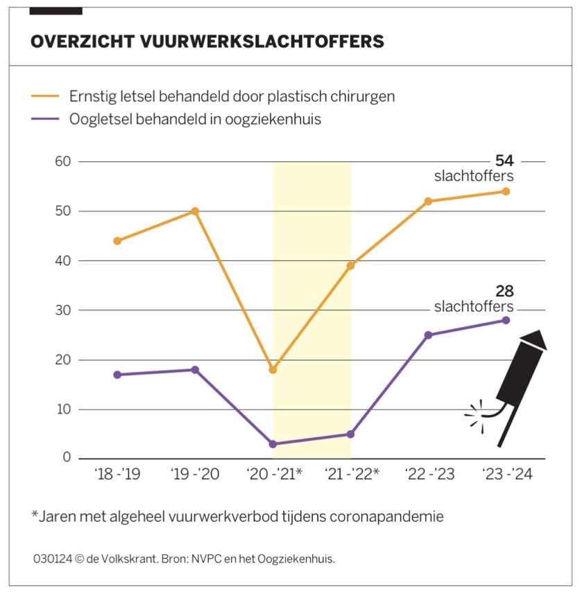 Aantal vuurwerkslachtoffers dit jaar opnieuw toegenomen januari 4, 2024 Bron: Volkskrant Datum: 4 januari 2024 Vorige Volgende